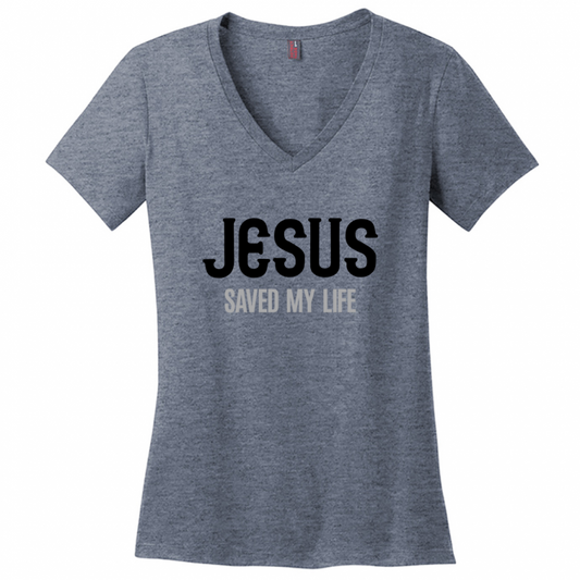 Jesus Saved My Life Women's Black & Gray Design V-Neck T-Shirt