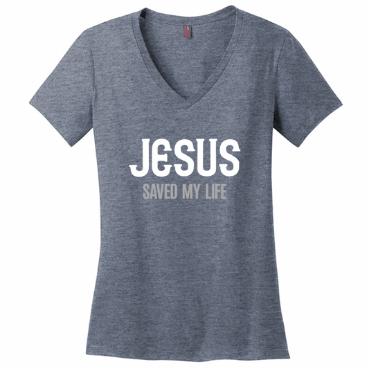 Jesus Saved My Life Women's White & Gray Design V-Neck T-Shirt