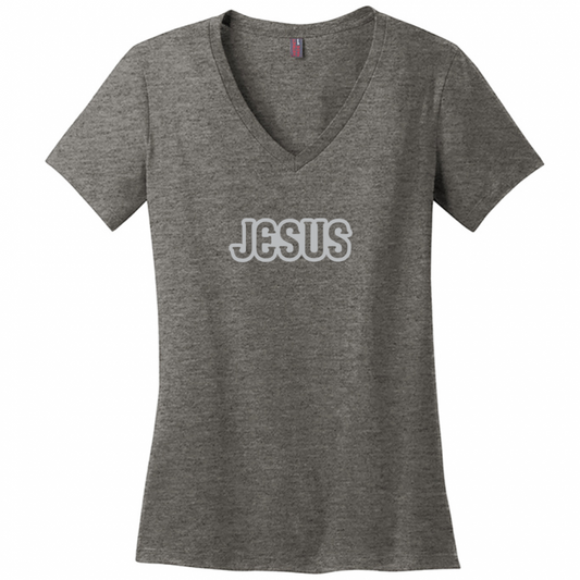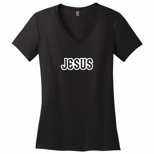 Jesus Saved My Life Women's Black & Gray Design V-Neck T-Shirt